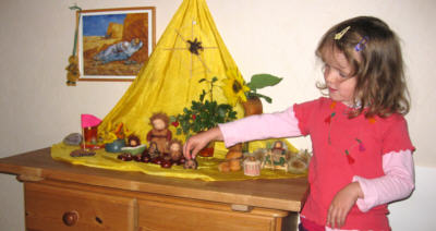 Auf einem Tuch, welches zu jeder Jahreszeit ein bestimmtes Farbenkleid trägt, finden Blumenkinder, Mutter Erde, Krippenfiguren, König Winter etc., Blumen und viele Schätze, die von den Kindern gefunden werden, wie zum Beispiel ein Schneckenhaus, Nüsse, Kastanien, eine schöne Wurzel etc. ihren besonderen Platz. Vielleicht findet sich auch eine schöne Kunstkarte alter oder neuer Künstler dazu ein? Es ist wunderbar, wenn mit der Zeit jede Familie ihren eigenen Stil für die Ausgestaltung ihres Jahreszeitentisches findet und er nicht eine Kopie aus irgendeinem tollen Buch bleibt.