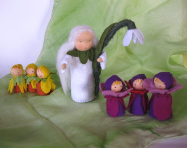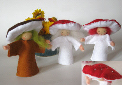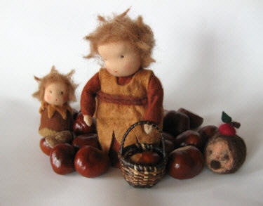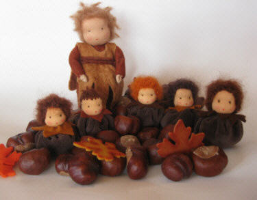 kleine Kastanienmutter mit Kastanienkind und IgelPilzgruppe mit Steinpilz und 2 Fliegenpilzengroße Kastanienmutter mit ihrenKastanienkindernEinschlafpuppe "Jossel" (rechts) mit Trösterchen (links)König WinterFrühlingsboten (Schneeglöckchen Sarah mit Winterlingen und Kroküsschen)Spielpuppe "Rosali" und "Lilali"Erdbeerengroßes und kleines GänseblümchenFee "Rosa"Fee "Türkis"Fee "Lila"Fee "Himmelblau"